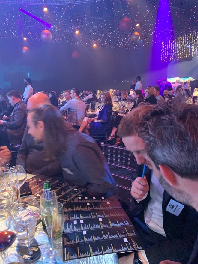 授賞式会場のロンドンEvolutionというイベント会場に入ると、まずは全室のBARコーナーでウェルカムドリンク。クリスマスな歌とダンスで、いっきにイベントが始まるぞ感につつまれつつ、周囲の人たちとのソーシャルな時間を過ごします。私が会場に入ったのは18:30頃、テーブル席に案内される19:00までこの前室で、シャンパンを飲んだり、ショーを楽しんだりしました。