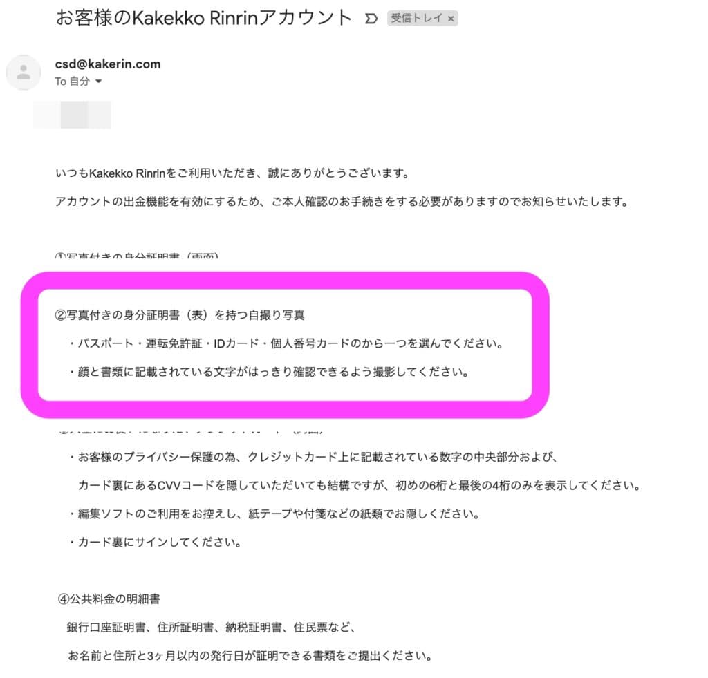 ちなみに、アカウント認証をする前に画像のように本人確認を促すような内容のメールが送られてくる場合もあります。その際は、メールに返信をする形で必要書類を添付するようにしましょう。